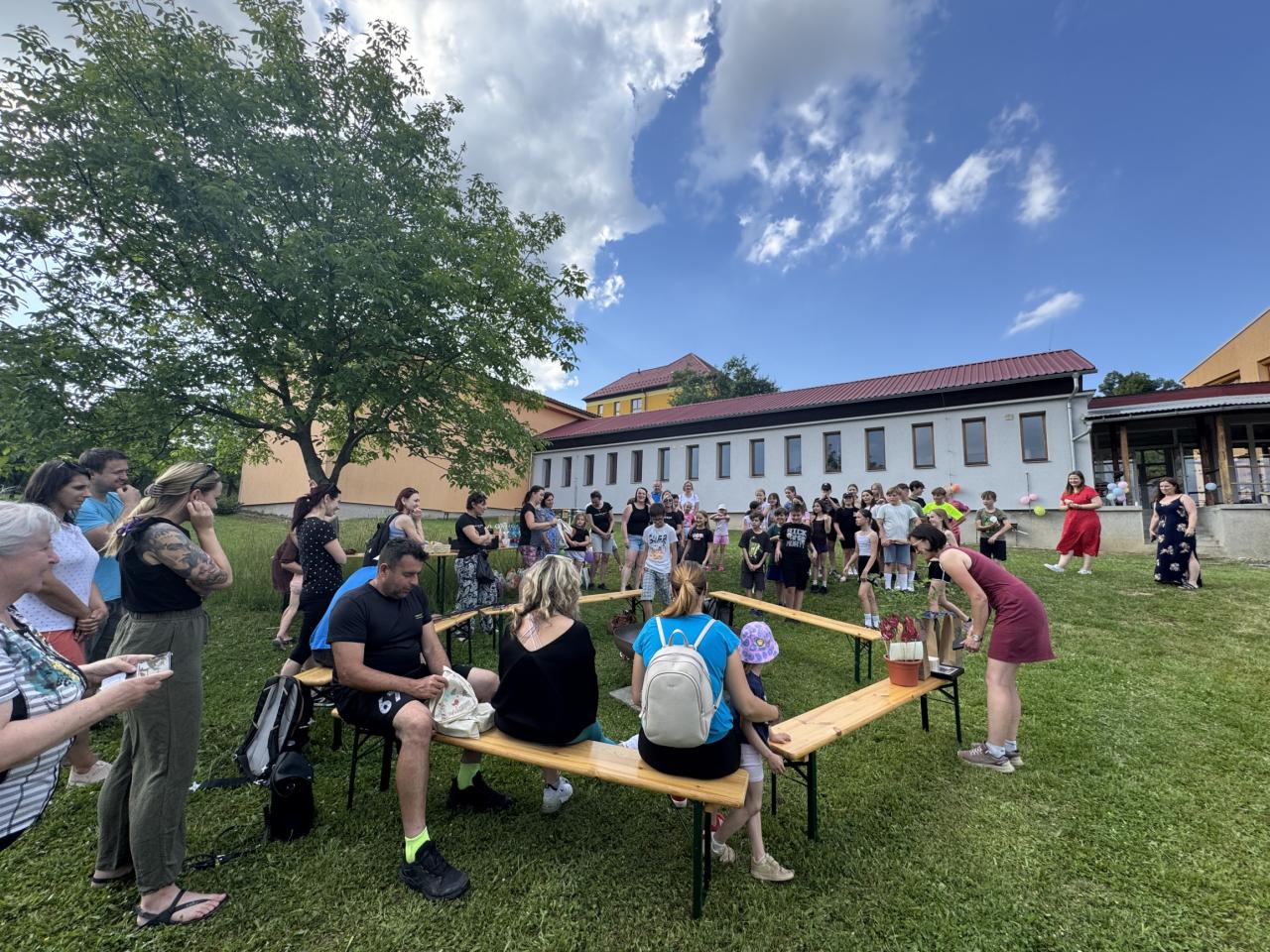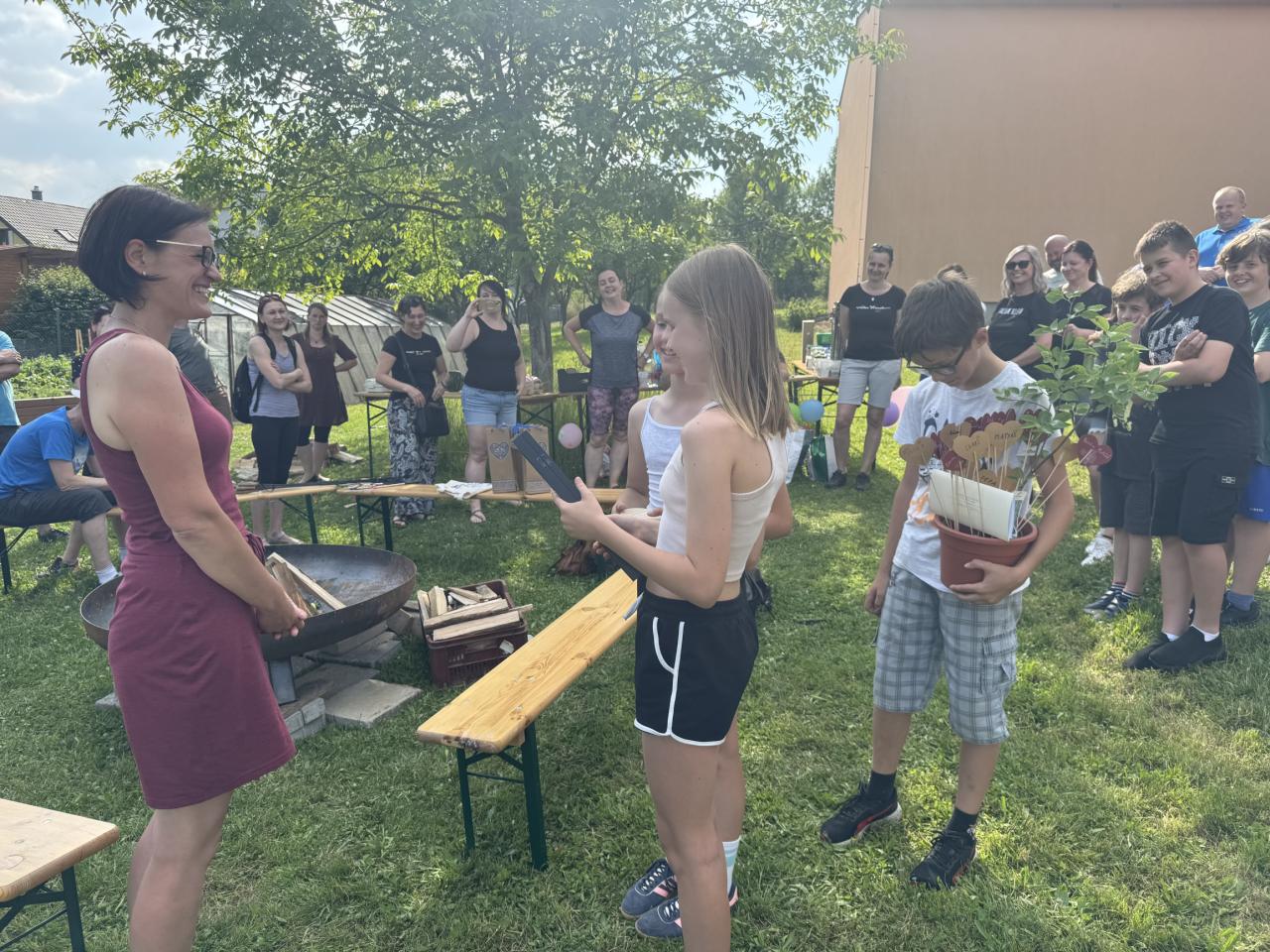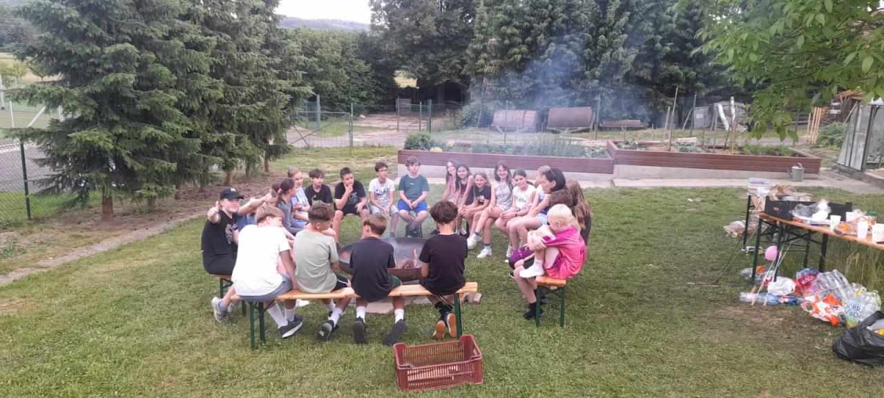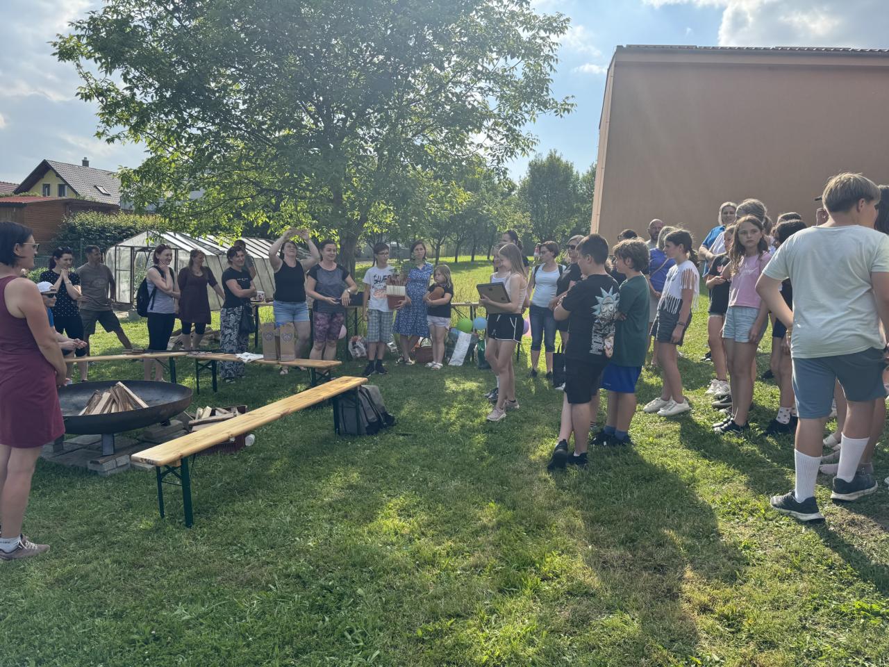 Pomocí křesadla byl zažehnutý oheň, na kterém jsme opékali špekáčky. Pochutnávali jsme si na jahodových, třešňových, perníkových, pudinkových a jiných dobrotách, které připravili rodiče. Děti hrály na hřišti nejrůznější hry a rodiče si mohli popovídat. Jak se setmělo, vyrazili jsme s dětmi na stezku odvahy...malá dušička byla chviličku, myslím, ve všech. Poté stanové městečko ulehlo...Myslím, že se rozlučka podařila.
