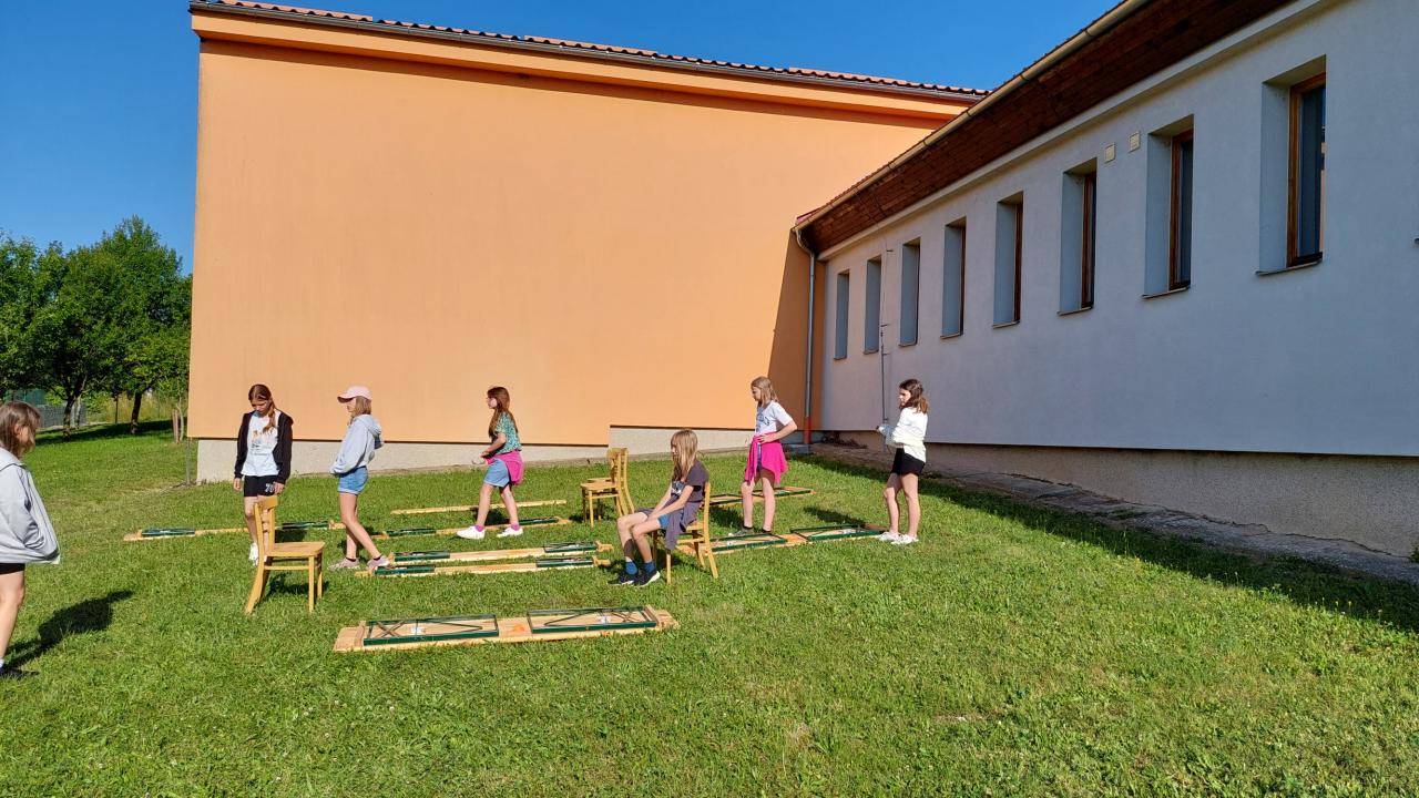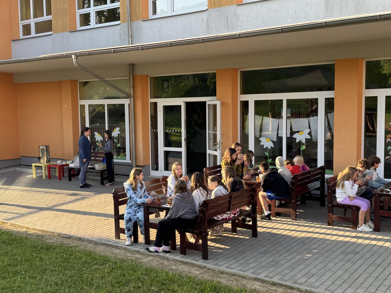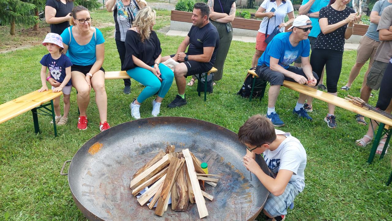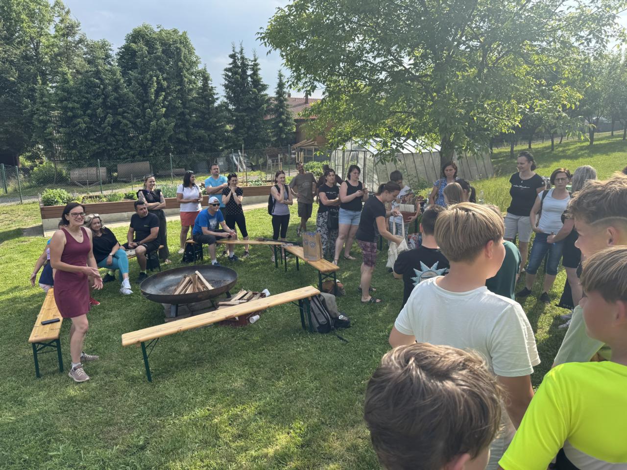 Pomocí křesadla byl zažehnutý oheň, na kterém jsme opékali špekáčky. Pochutnávali jsme si na jahodových, třešňových, perníkových, pudinkových a jiných dobrotách, které připravili rodiče. Děti hrály na hřišti nejrůznější hry a rodiče si mohli popovídat. Jak se setmělo, vyrazili jsme s dětmi na stezku odvahy...malá dušička byla chviličku, myslím, ve všech. Poté stanové městečko ulehlo...Myslím, že se rozlučka podařila.