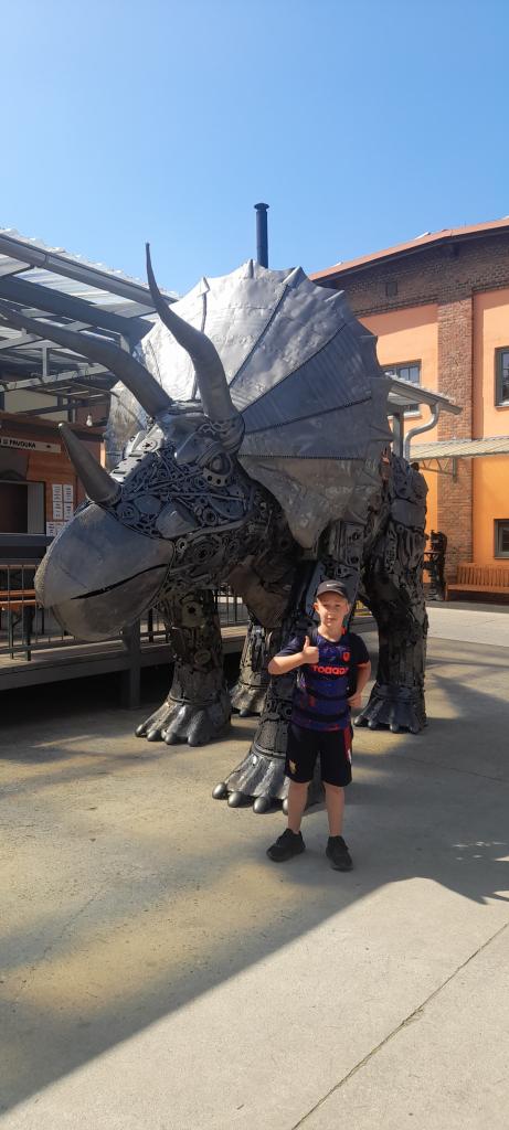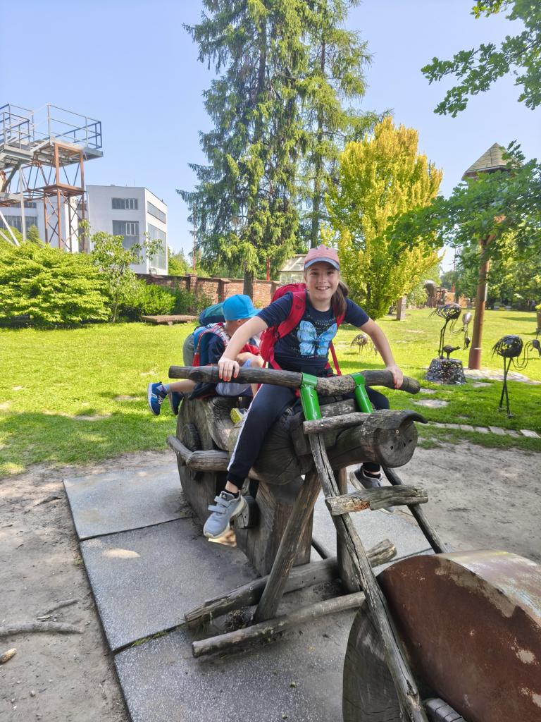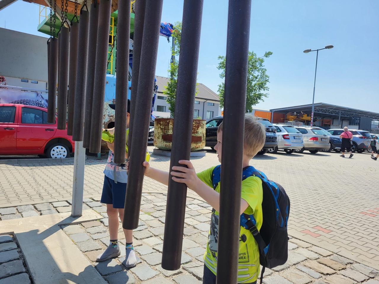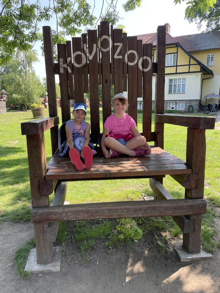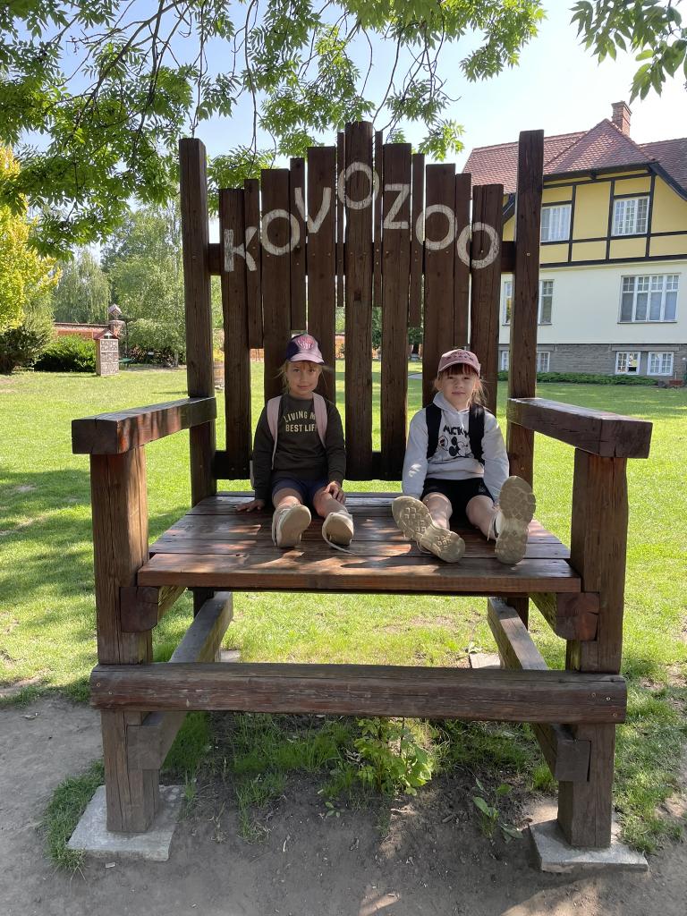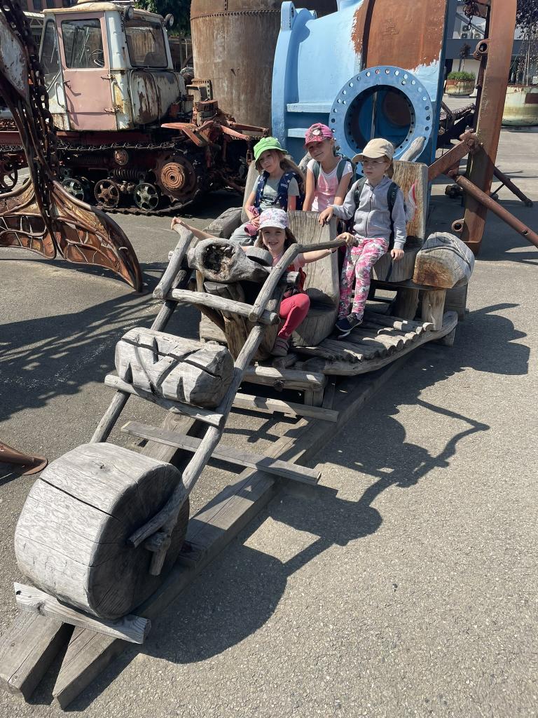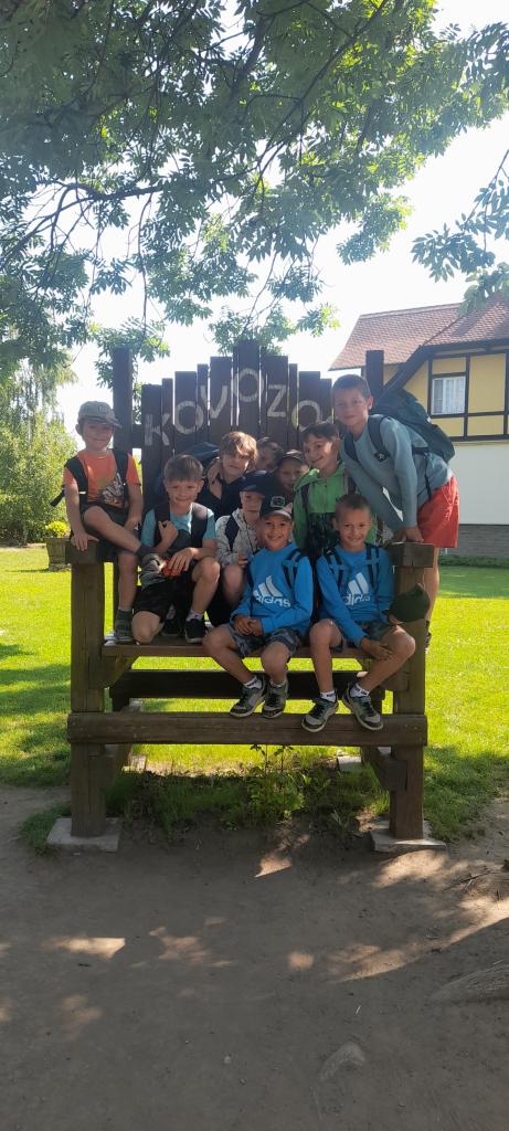 V KOVOZOO nás pak čekala spousta neobyčejných zvířat, všichni tito tvorové byli vyrobeni z kovového odpadu. Děti tak mohly obdivovat slony, žirafy, medvědy a třeba i stádo kovových prasat, jaké by doma v chlívku maminky ani babičky určitě nechtěly. Paní učitelky i asistentky si poseděly na lavičce nebo houpačce pod kovovou vrbou, která měla místo lístků stovky nebo i tisíce zámků, zatímco děti se vydováděly v „Gumolandu“, na pyramidách poskládaných z ojetých pneumatik. Kromě zvířat jsme okukovali i staré hasičské a zemědělské stroje, kovový kočár nebo obrovskou židli, na kterou se namačkaly děti z celé třídy. Vyhlídkové lávky nám umožnily krásný pohled na celý areál – no řekněte, kolikrát v životě se vám poštěstí mít pod sebou stáda zvířat, i když jen kovových?