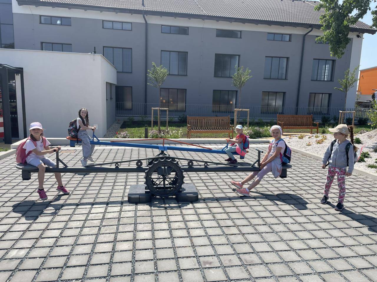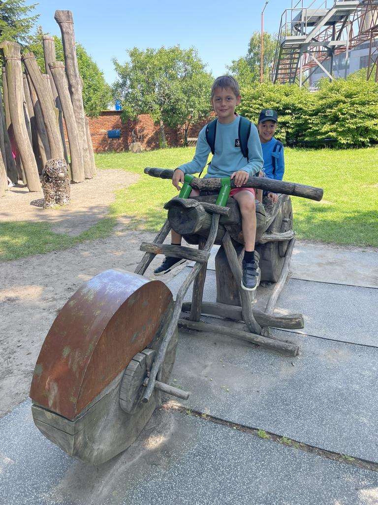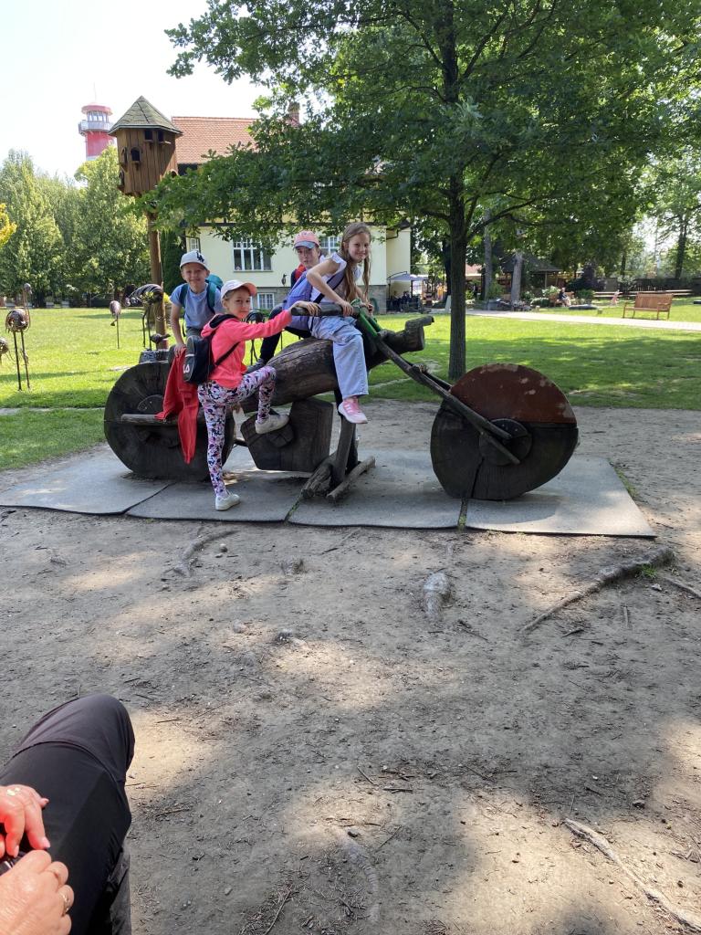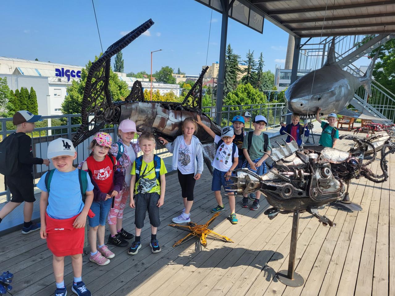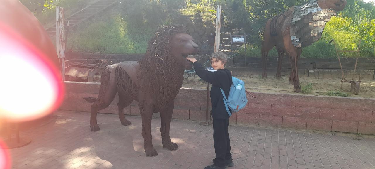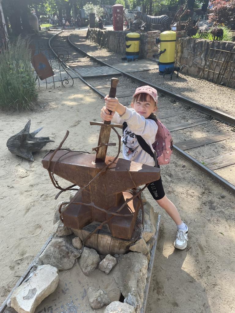 V KOVOZOO nás pak čekala spousta neobyčejných zvířat, všichni tito tvorové byli vyrobeni z kovového odpadu. Děti tak mohly obdivovat slony, žirafy, medvědy a třeba i stádo kovových prasat, jaké by doma v chlívku maminky ani babičky určitě nechtěly. Paní učitelky i asistentky si poseděly na lavičce nebo houpačce pod kovovou vrbou, která měla místo lístků stovky nebo i tisíce zámků, zatímco děti se vydováděly v „Gumolandu“, na pyramidách poskládaných z ojetých pneumatik. Kromě zvířat jsme okukovali i staré hasičské a zemědělské stroje, kovový kočár nebo obrovskou židli, na kterou se namačkaly děti z celé třídy. Vyhlídkové lávky nám umožnily krásný pohled na celý areál – no řekněte, kolikrát v životě se vám poštěstí mít pod sebou stáda zvířat, i když jen kovových?