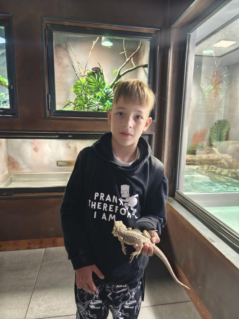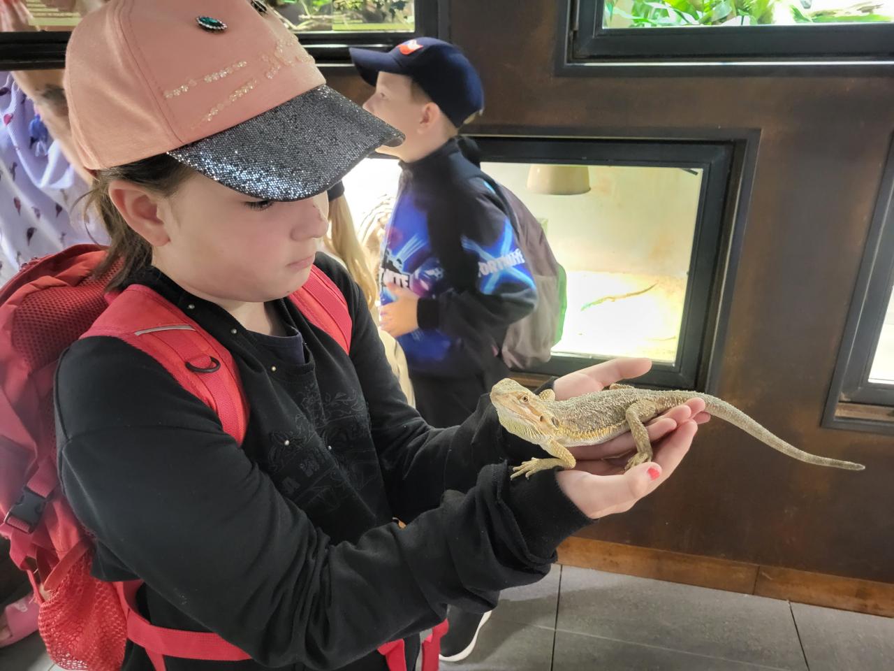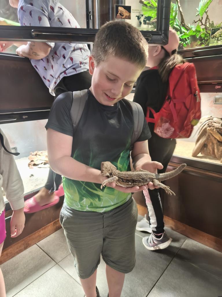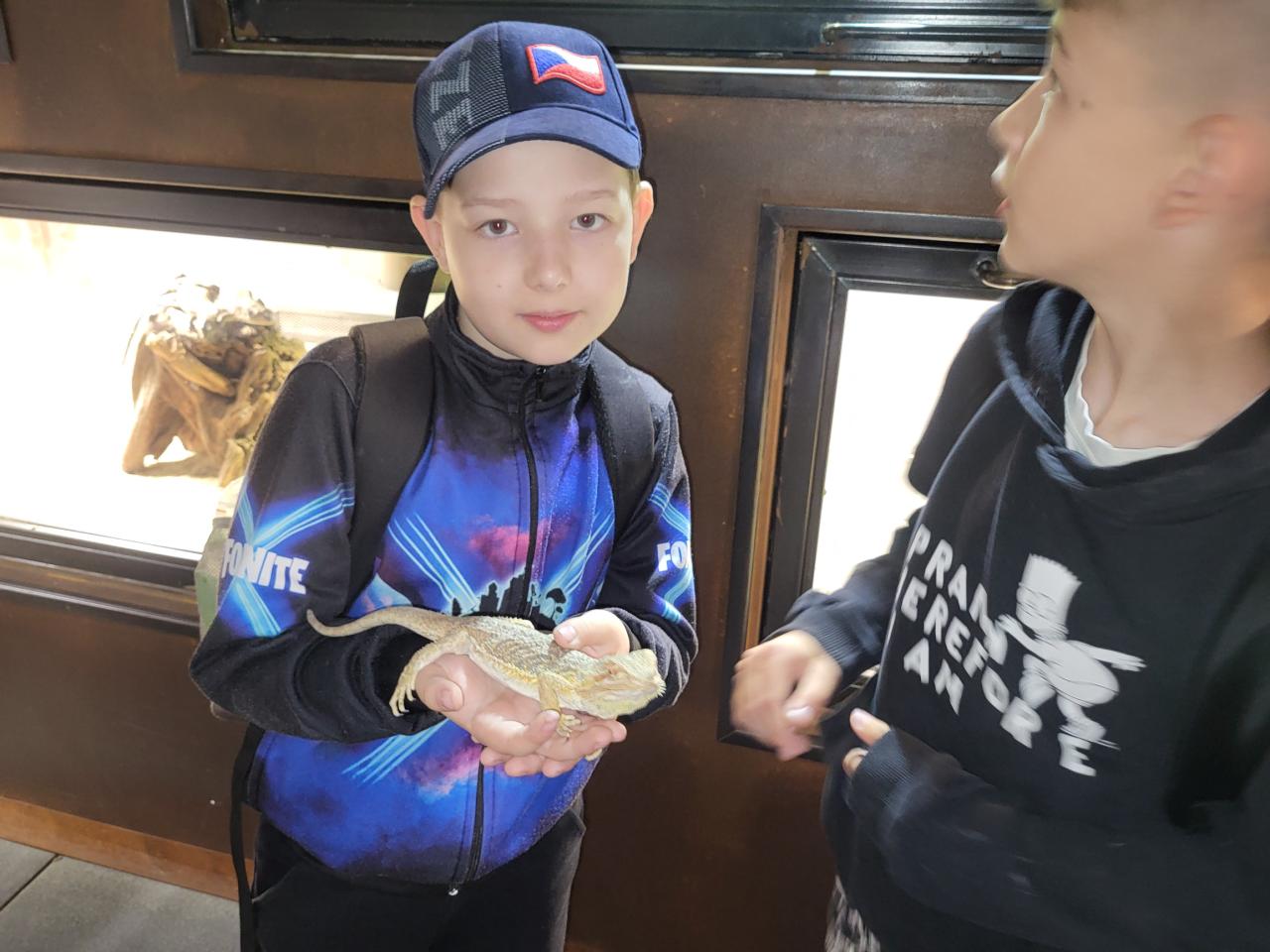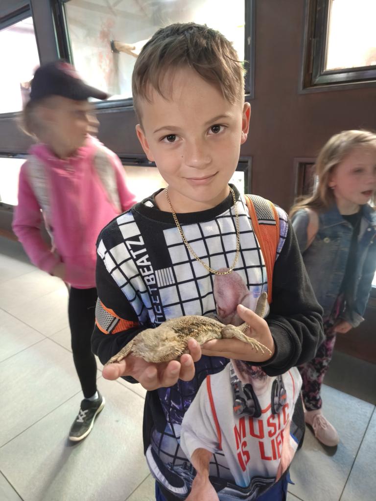 Po příjezdu k areálu jsme se rozdělili na dvě skupiny – jedna zamířila nejprve do terária, druhá do samotného areálu KOVOZOO. A co že se dělo v teráriu? Pavouci, hadi, žáby, ještěrky a želvy, prostě všechno, co by dětem pořídil domů jako domácího mazlíčka málokterý rodič. Největší úspěch sklidil plazící se had, ukrytý pavouk a agama, kterou si děti mohly nejen prohlédnout, ale i pohladit. Někteří žáci už plánovali, jestli by ji nemohli mít doma místo křečka nebo rybiček.