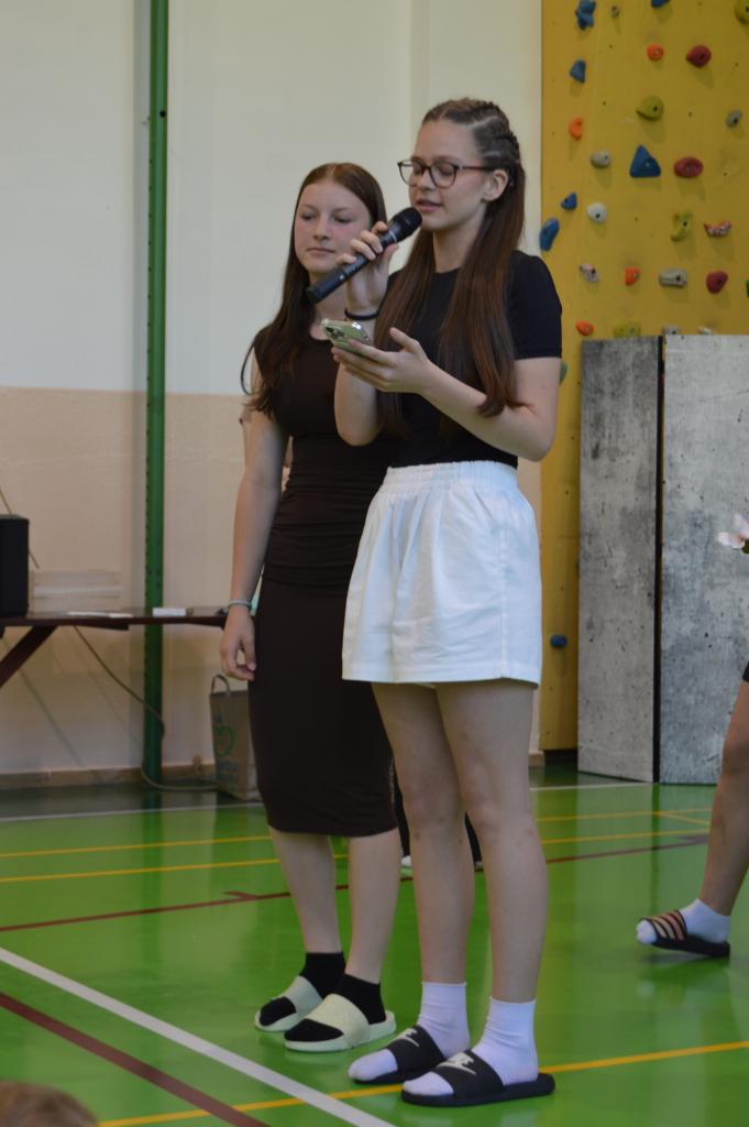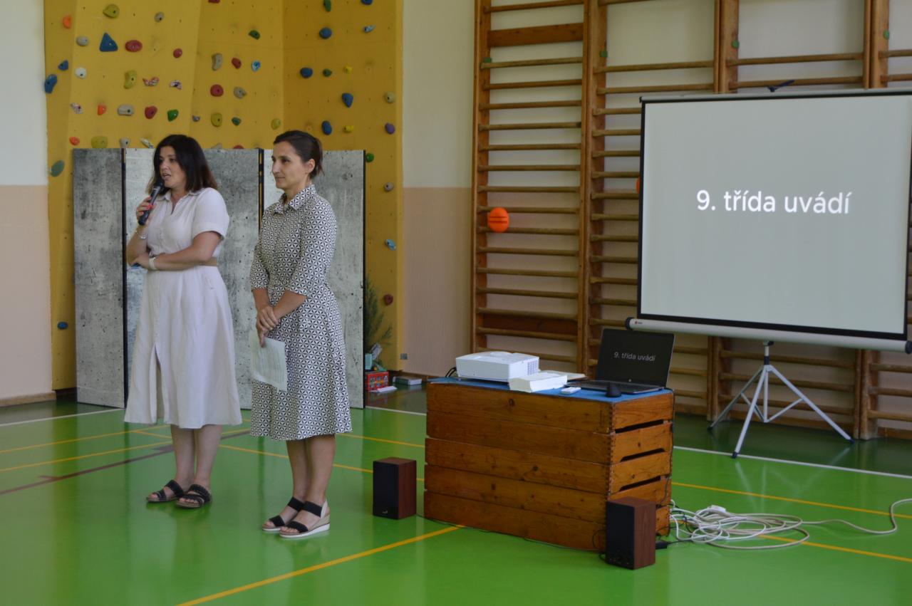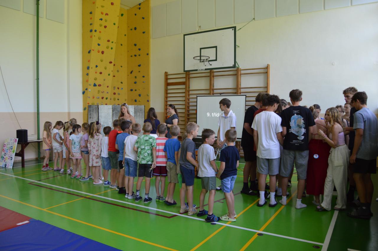 Žáci devátých tříd se také rozloučili se zaměstnanci školy a především s našimi prvňáčky, kterým po celý rok byli patrony. Během roku společně tvořili různé akce, které pomohly prvňáčkům zvládnout první školní rok a zároveň posílily vztahy mezi ročníky. Na závěr školního roku se prvňáčci s deváťáky rozloučili, předali jim drobné dárečky a poděkovali za společně strávený čas.