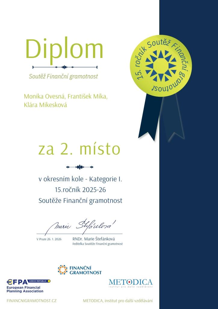 Za mladší kategorii byli vybráni František Míka, Klára Mikesková, Monika Ovesná a za starší kategorii Nela Mačková, Denis Jurča a Filip Štajner. V okresní kole společně každý tým vypracovával kvíz zaměřený na finanční gramotnost. Mladší žáci i starší žáci se umístili na krásném 2. místě, a tedy postoupili do krajského kola.