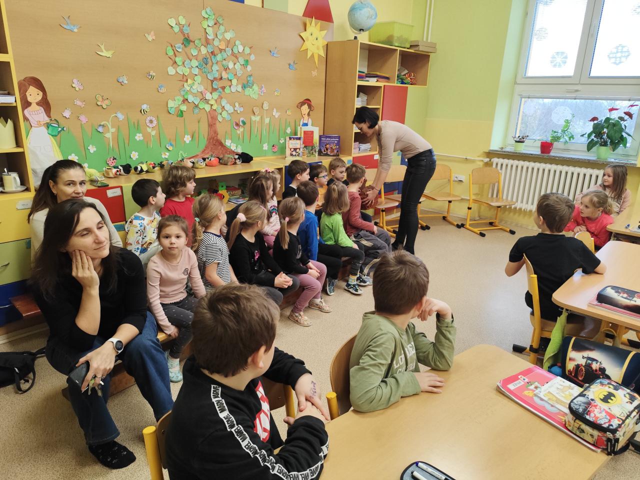 Prvňáčci jim s nadšením ukázali, co se za první půlrok ve škole naučili, předvedli své čtenářské dovednosti i první psací pokroky. Pro malé návštěvníky si připravili také drobný dáreček v podobě papírového medvídka a paním učitelkám ze školky předali kytičku.