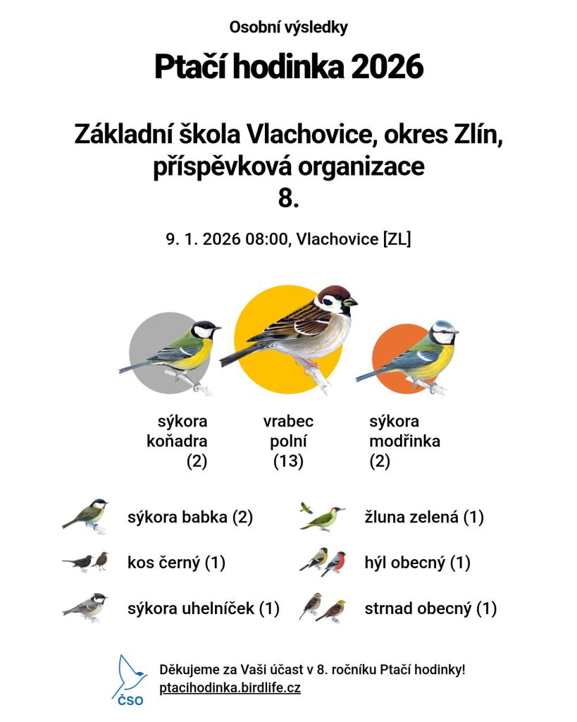 I letos se naše škola zapojila do akce Ptačí hodinka, kterou každoročně pořádá Česká společnost ornitologická začátkem ledna. Tentokrát měli sčítání ptáků na krmítku na starosti žáci osmé třídy. Během 60ti minut pozorovali na zahradě školy 9 ptačích druhů.